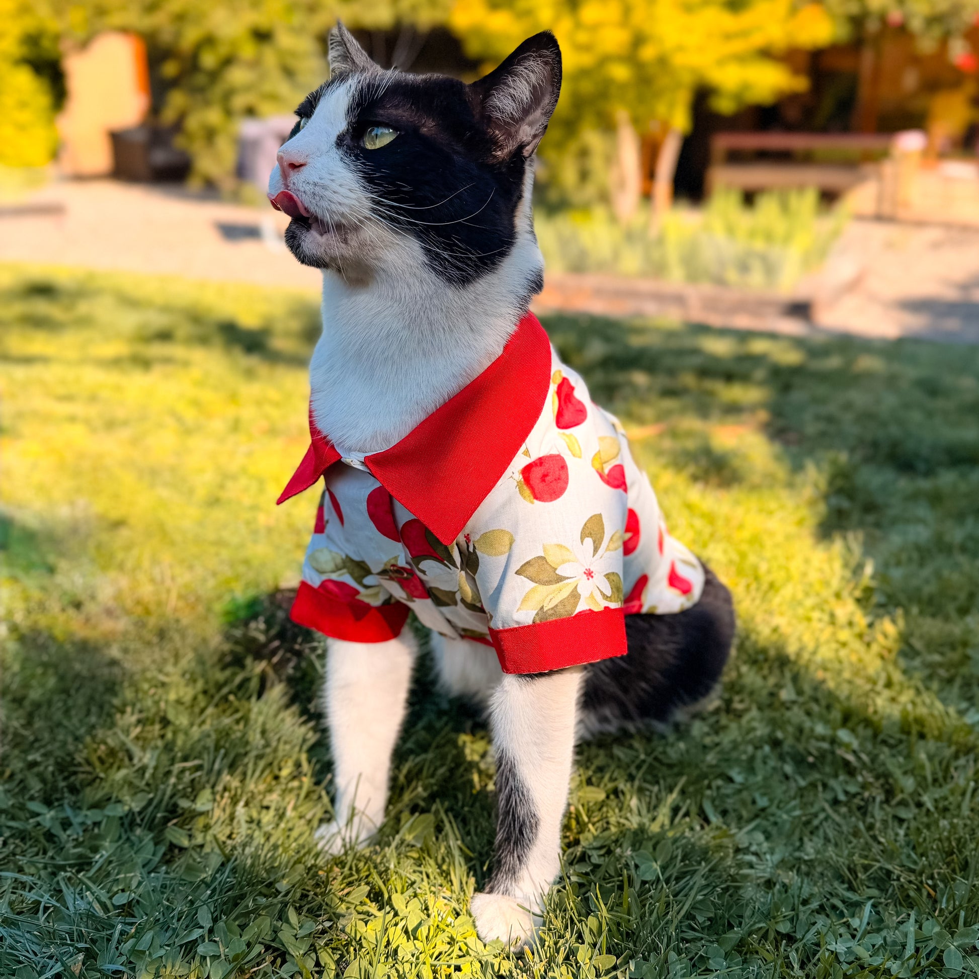 Una prenda fresca, alegre y con mucho estilo. Esta camisa destaca por su estampado de manzanas rojas con hojas verdes, perfecta para días soleados o paseos al aire libre.