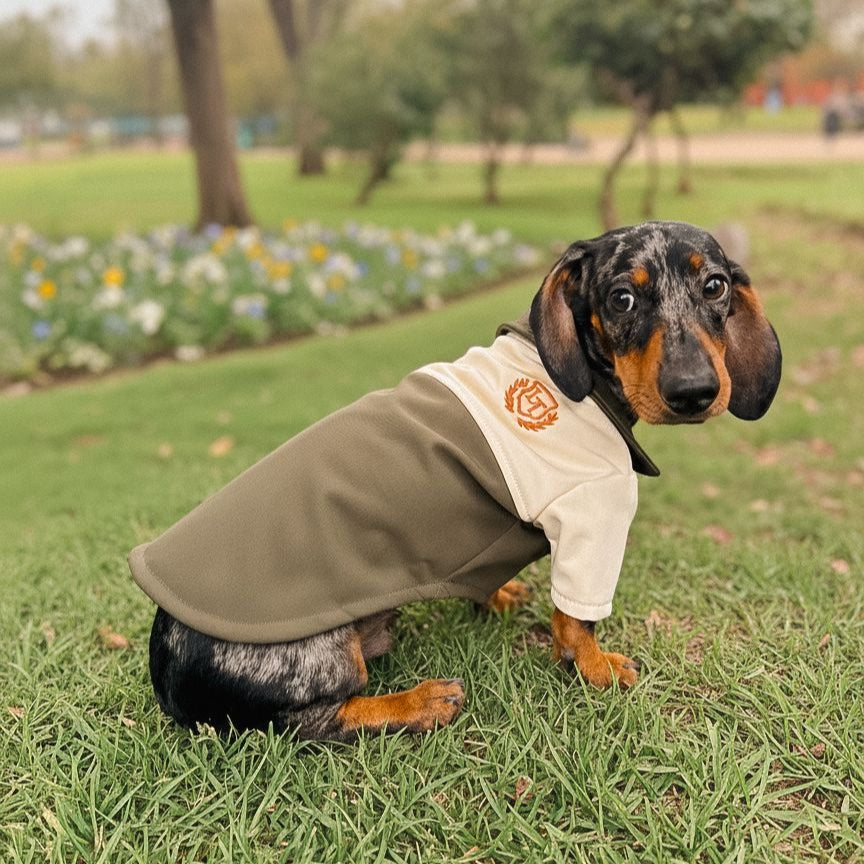 Esta chaqueta para mascotas combina estilo y funcionalidad en una prenda perfecta para los días fríos. Su exterior en tono verde oscuro se complementa con detalles en blanco en las mangas y cuello, mientras que su interior en cálido polar verde oscuro asegura abrigo y confort. El cierre frontal en color naranja aporta un toque moderno y práctico, facilitando su uso. El borde inferior con diseño a rayas amarillas y blancas añade un detalle original y llamativo. Ideal para mascotas con personalidad fuerte y estilo urbano.