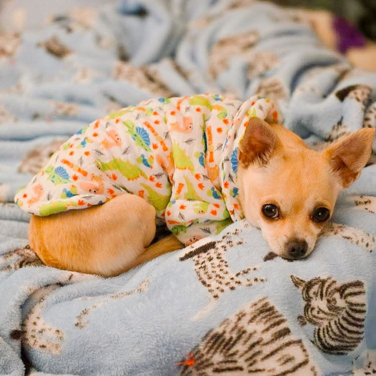 Esta colorida parka acolchada con estampado de dinosaurios es perfecta para los peludos más juguetones y aventureros. Su diseño alegre sobre fondo blanco destaca por sus simpáticos dinos en tonos verdes, azules y naranjos, acompañados de pequeños detalles gráficos. El interior está forrado en suave chiporro blanco que brinda abrigo y confort durante los días fríos, mientras que el cierre frontal azul facilita su uso. El borde inferior celeste completa el look con un toque delicado. Ideal para mascotas con espíritu explorador y estilo único.