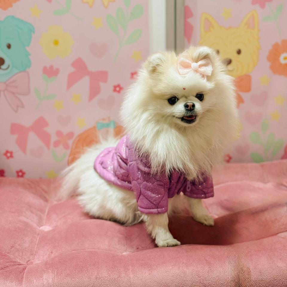 Esta adorable parka lila está diseñada para las mascotas que aman destacar con estilo y ternura. Su exterior acolchado con costuras en forma de corazones y pequeños brillos dorados le da un toque mágico y femenino. El interior está completamente forrado en peluche suave del mismo tono, ideal para mantener a tu peludo abrigado y cómodo durante el invierno. El cierre frontal en color a juego facilita su uso, y el borde inferior con estampa floral aporta un detalle delicado que la hace aún más especial. Perfecta para las reinas y reyes del paseo.