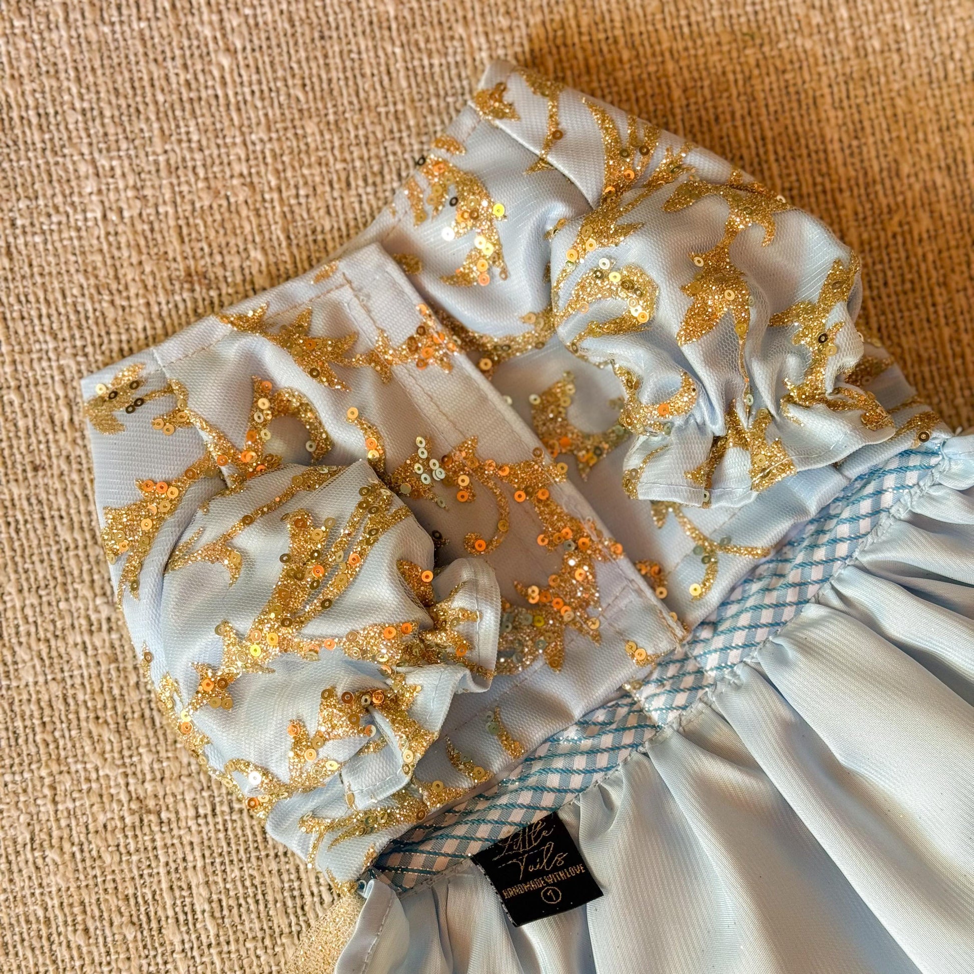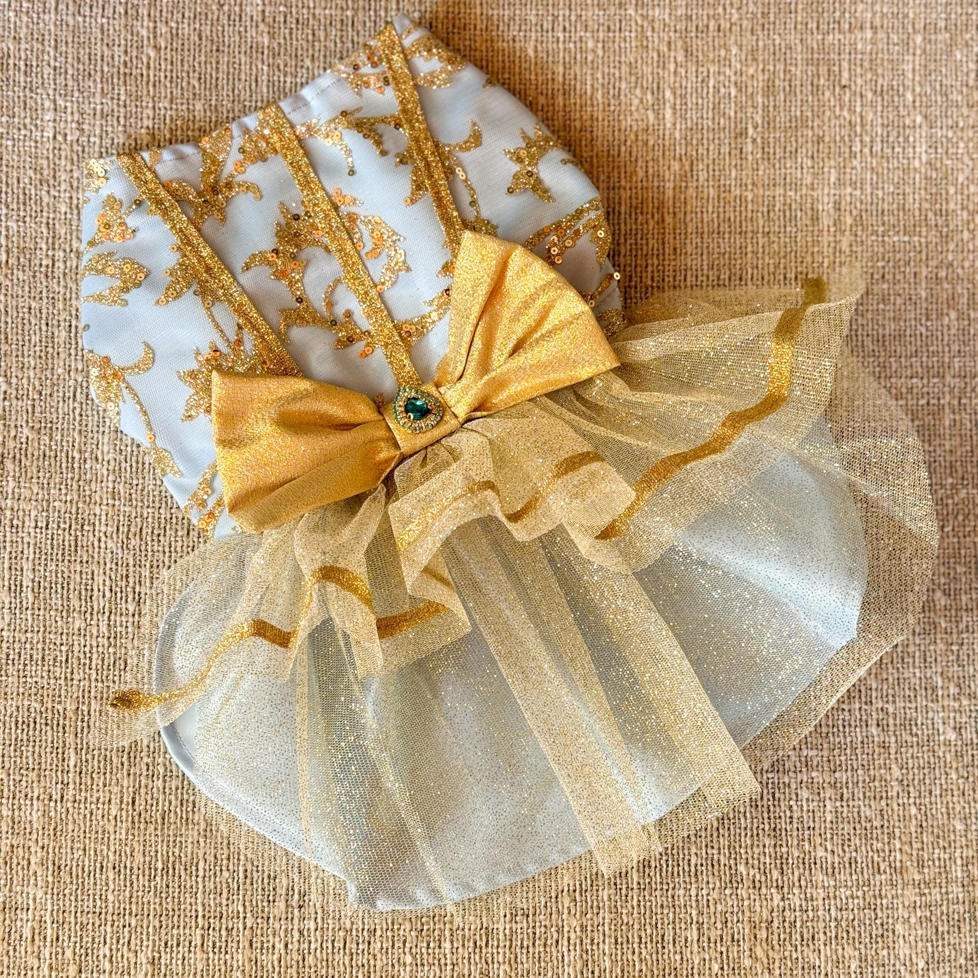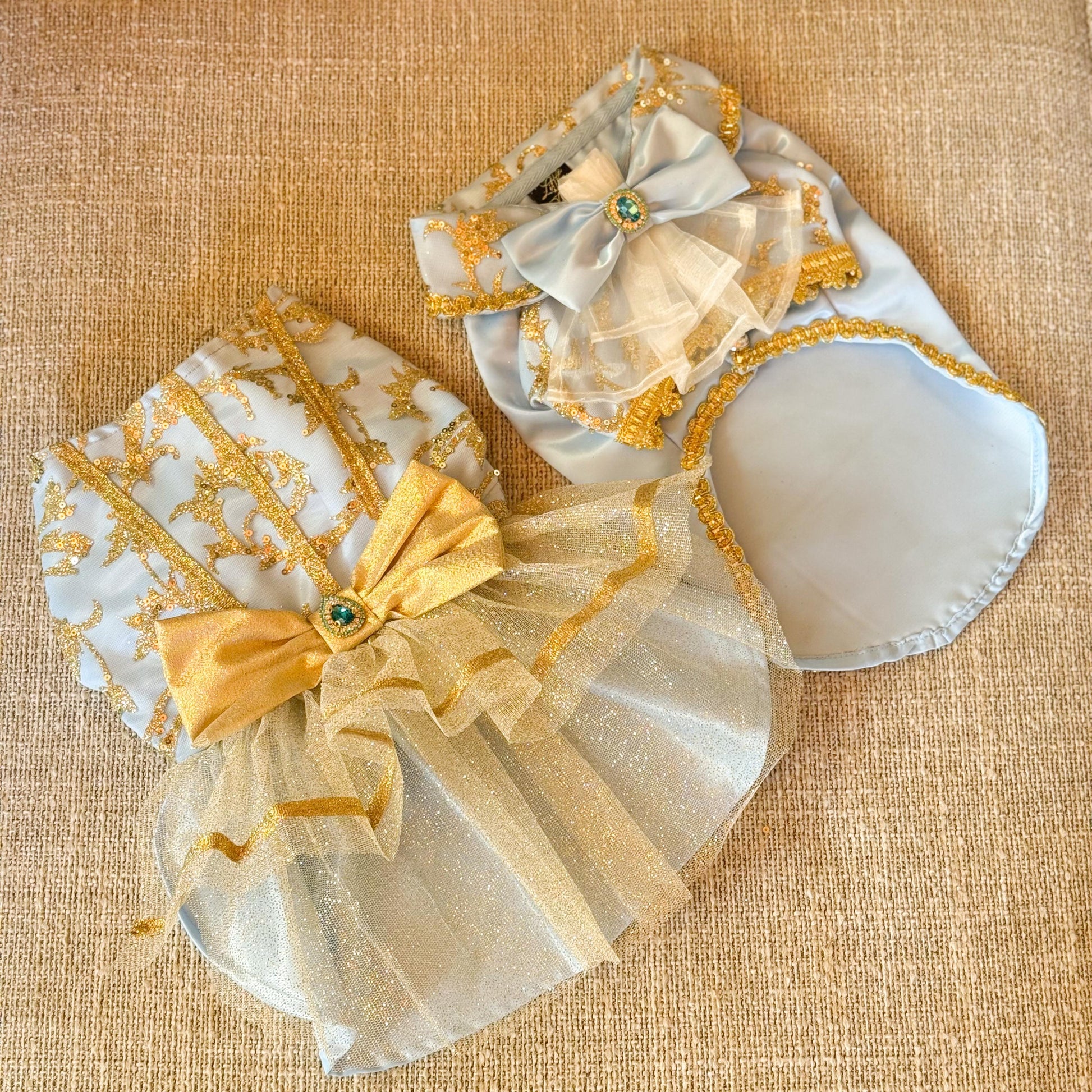 Un diseño que transforma a tu mascota en la verdadera protagonista de la noche más mágica del año. Este vestido está confeccionado en un delicado tono celeste brillante con detalles dorados que evocan la elegancia de la realeza. La falda de varias capas de tul con acabado tornasolado aporta movimiento y un efecto deslumbrante bajo las luces, mientras que el gran lazo dorado con incrustación central de pedrería azul realza el porte majestuoso.